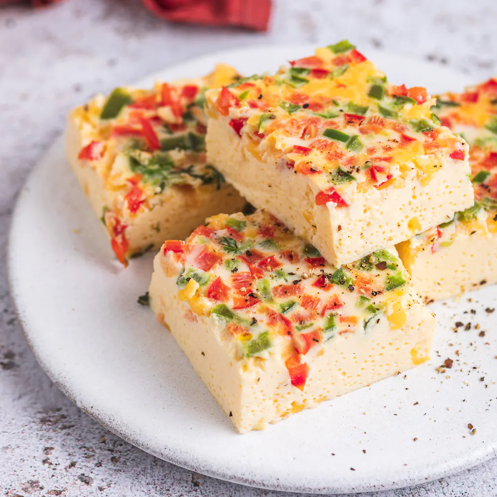 - Let the egg bites cool slightly, then lift them out of the dish by holding the sides of the parchment paper. Cut into 24 squares (if making 6 servings), which is 4 egg bites per serving.